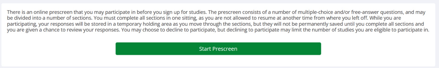 After signing in you will be ask to complete a brief prescreening survey. Please answer these questions as accurately as possible to help determine which studies you may opt in to.