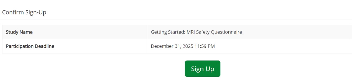 - Scroll to the bottom and select Sign Up. Completing this survey is imperative as it allows our team to gather detailed information about you to determine if it is safe to proceed with MRI scanning.