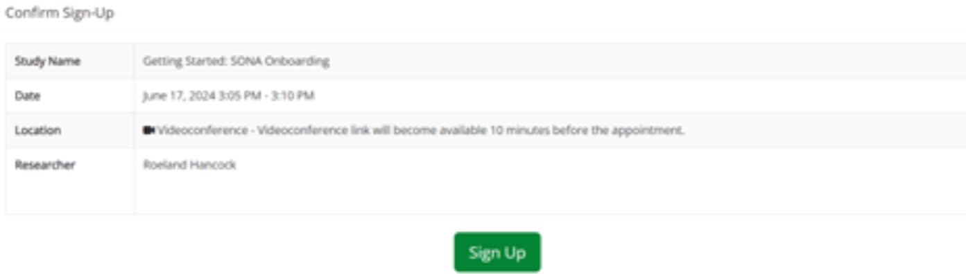 Click one of the green timeslots to sign up. On the following page, select Sign Up.