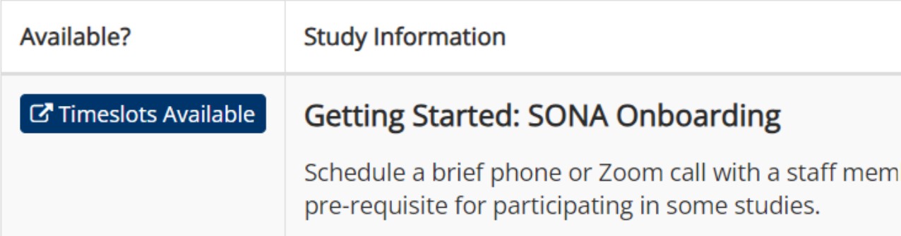 - From the study list, go to Getting Started: Sona Onboarding Under the Available? column, select Timeslots Available.