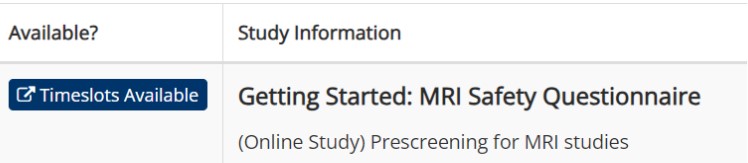 - Go to Getting Started: MRI Safety Questionnaire. Under the Available? column, select Timeslots Available.