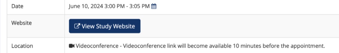 - After signing up for a timeslot, please be present for your Zoom call at that time. You will find this link on the study page under Website and View Study Website.